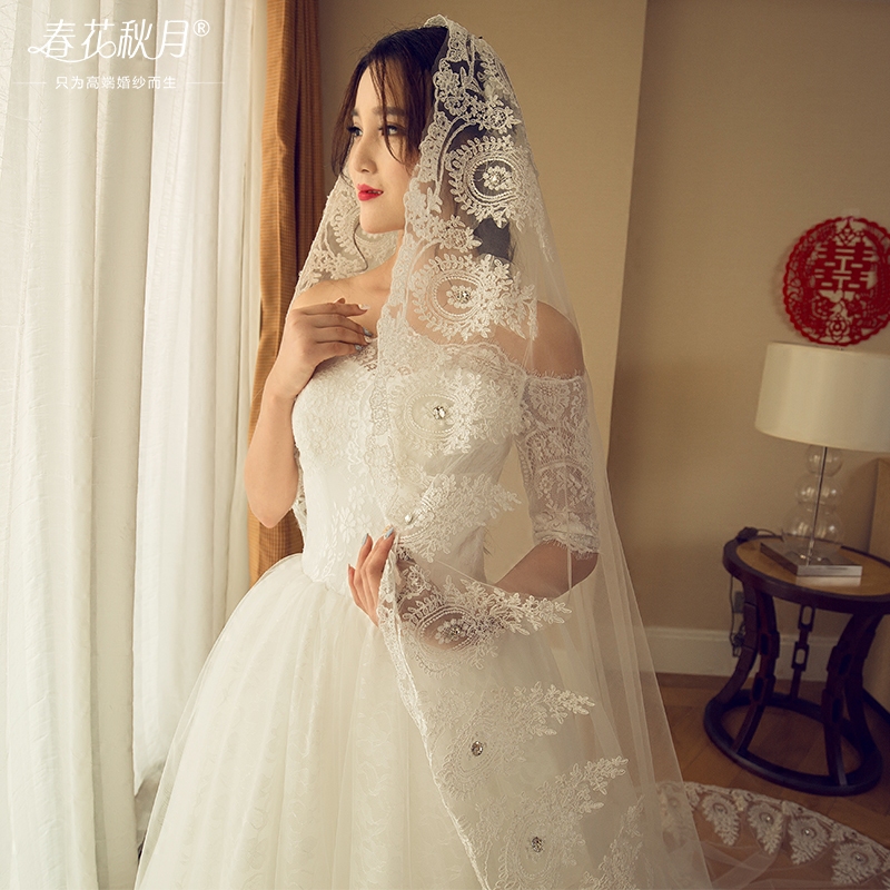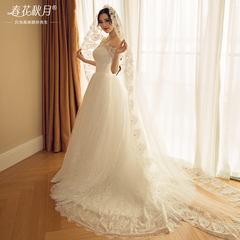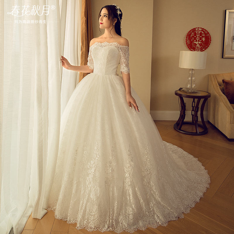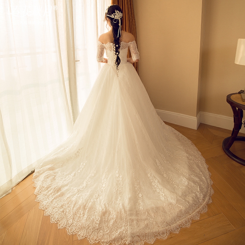 • 一字肩蕾絲婚紗禮服2016新長拖尾長袖冬季簡約大碼HS602