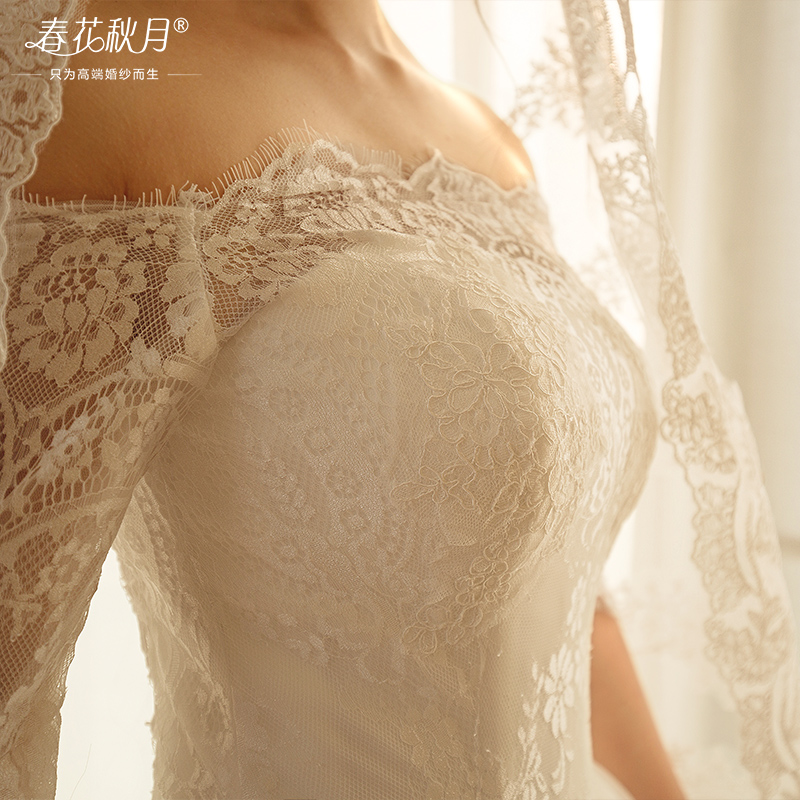 一字肩蕾絲婚紗禮服2016新長拖尾長袖冬季簡約大碼HS602