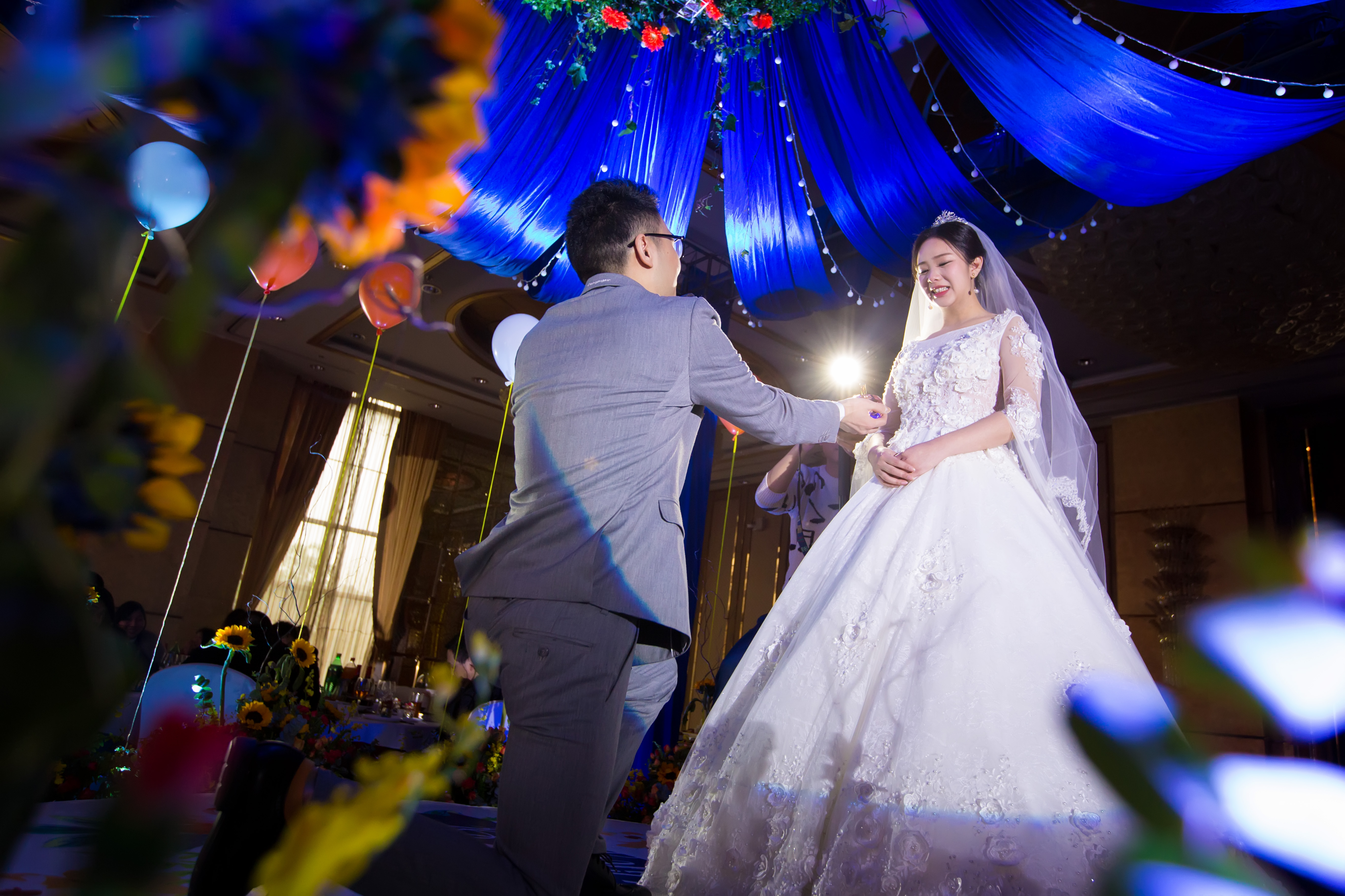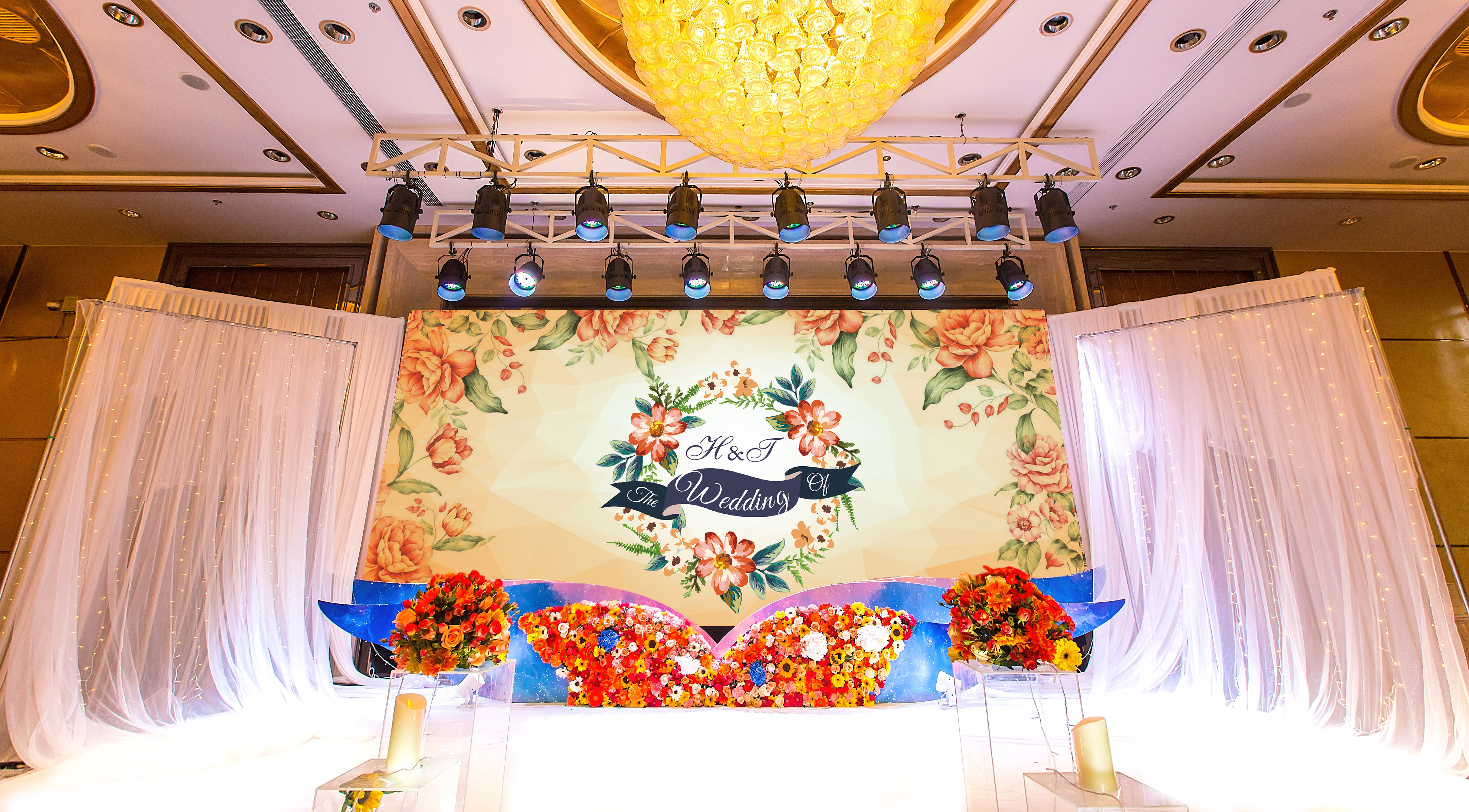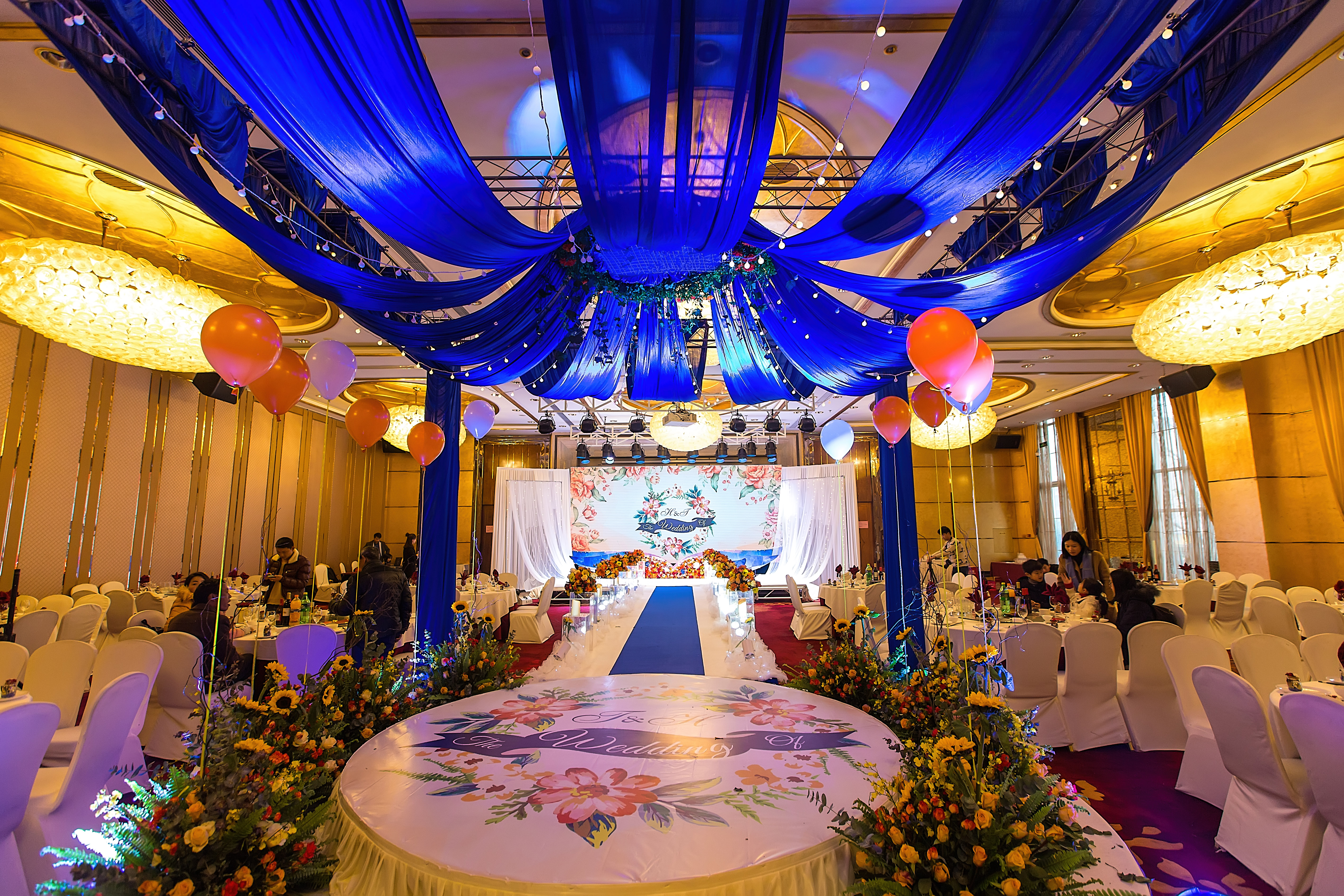 走心定制寶藍(lán)色+橘色婚禮,純鮮花布置