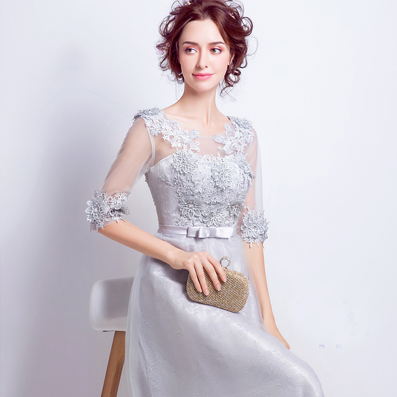 2017新款灰色蕾絲中長(zhǎng)袖伴娘服婚禮晚宴年會(huì)長(zhǎng)款婚紗74