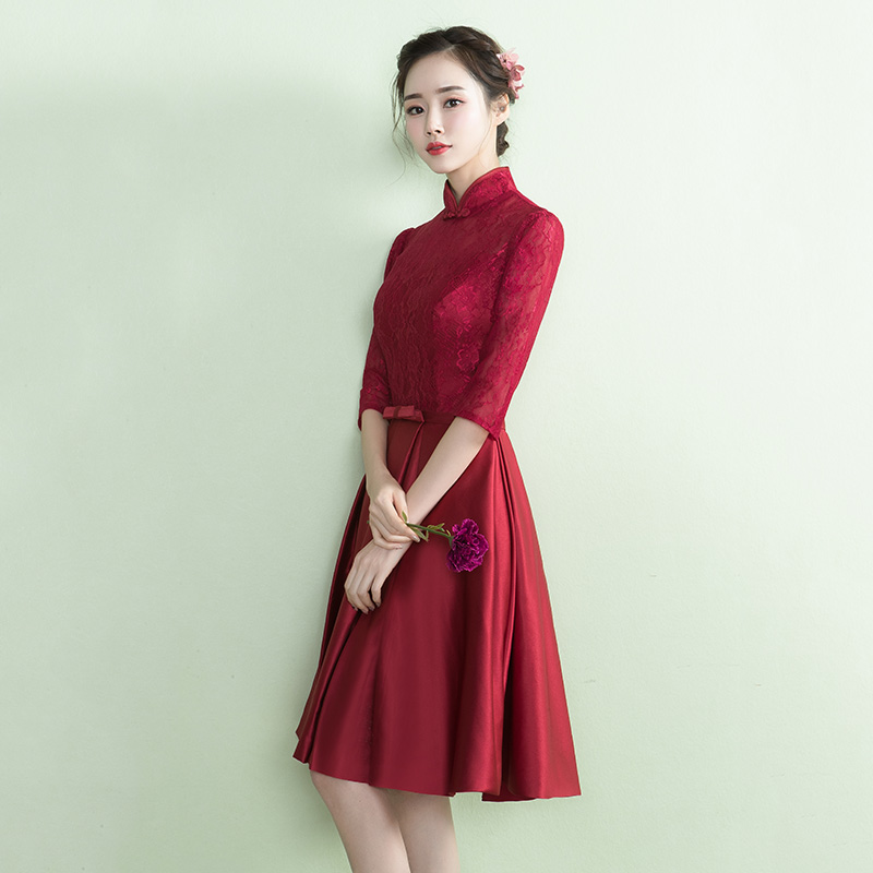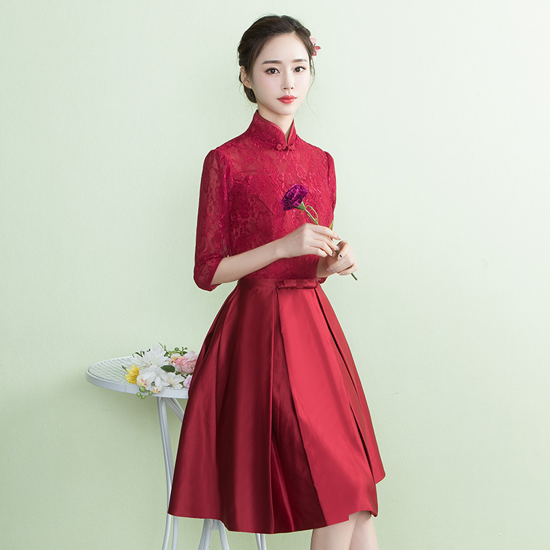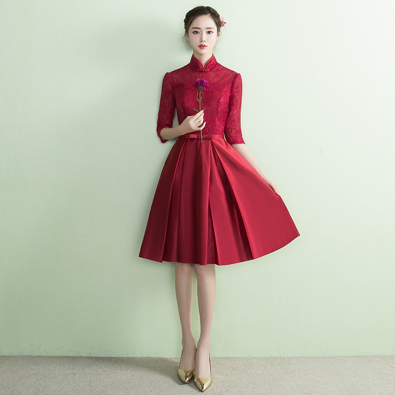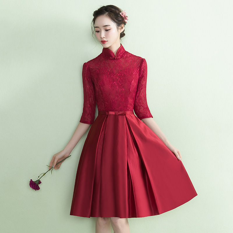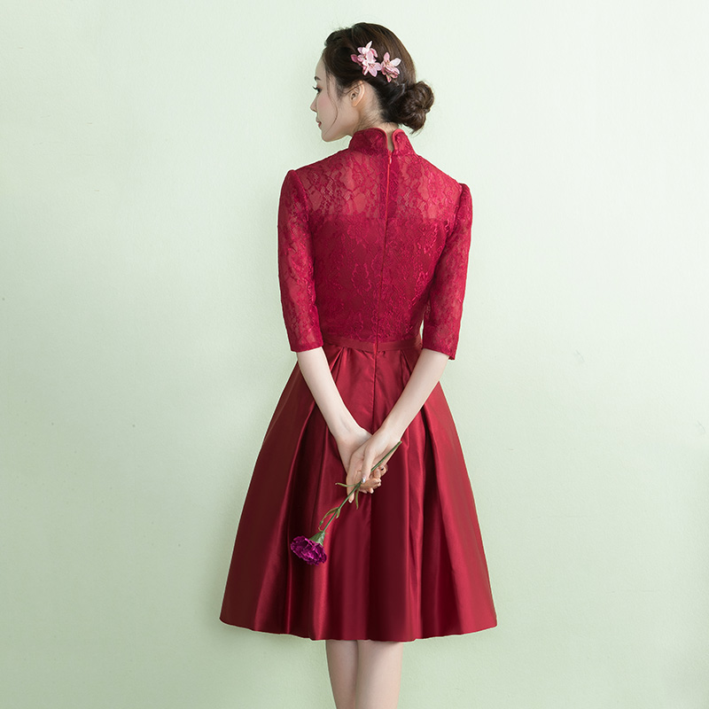 • 酒紅色中袖蕾絲敬酒服立領(lǐng)新娘禮服2017春季新款結(jié)婚晚禮服女