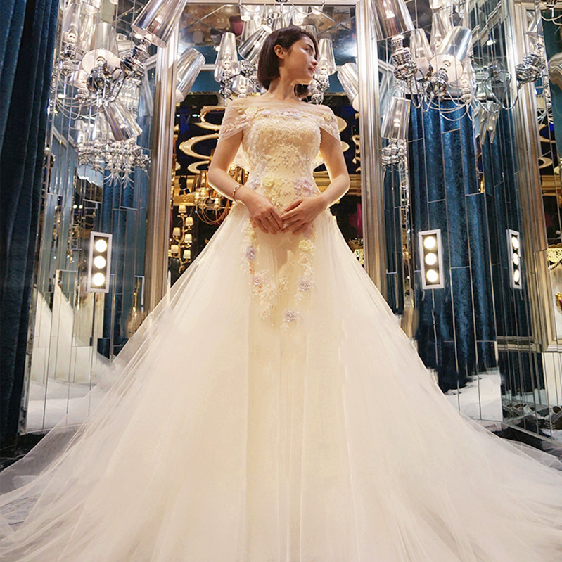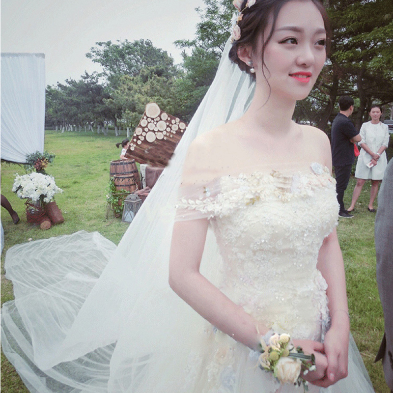 • 送6件套!婚紗禮服2017新款一字肩簡約新娘結(jié)婚韓式1米拖尾