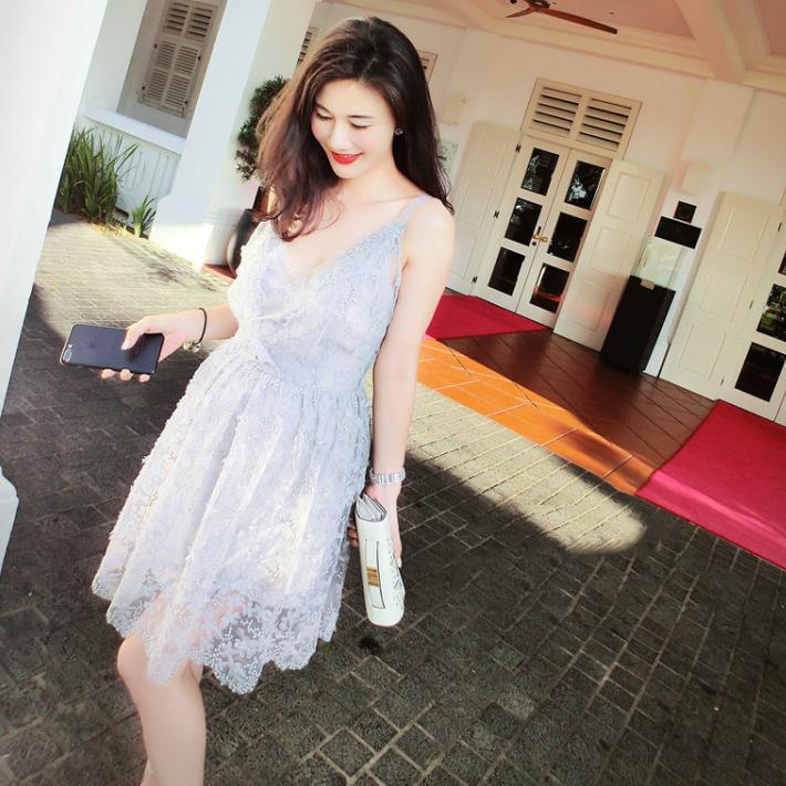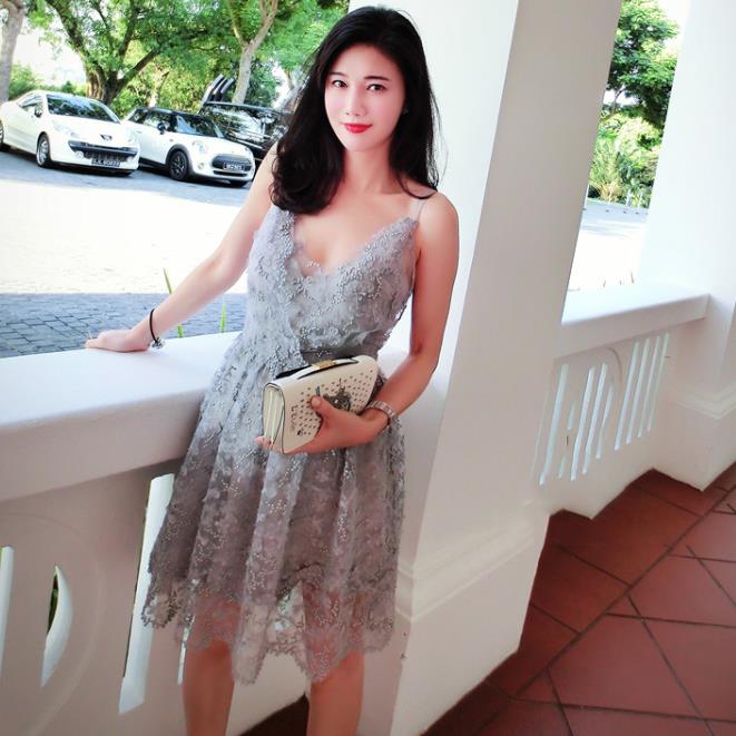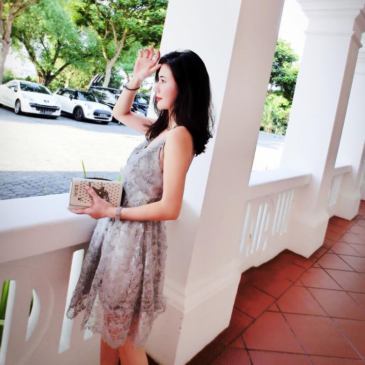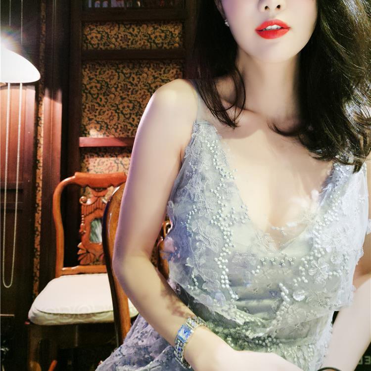 • 劉鈺懿同款伴娘服灰色蕾絲繡花吊帶高腰連衣裙女晚宴禮服敬酒服