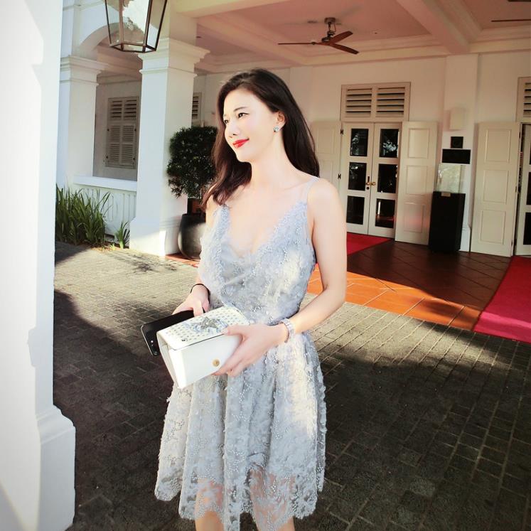 劉鈺懿同款伴娘服灰色蕾絲繡花吊帶高腰連衣裙女晚宴禮服敬酒服