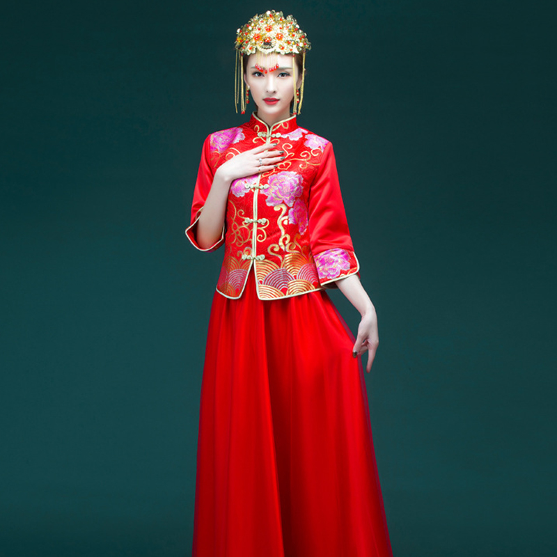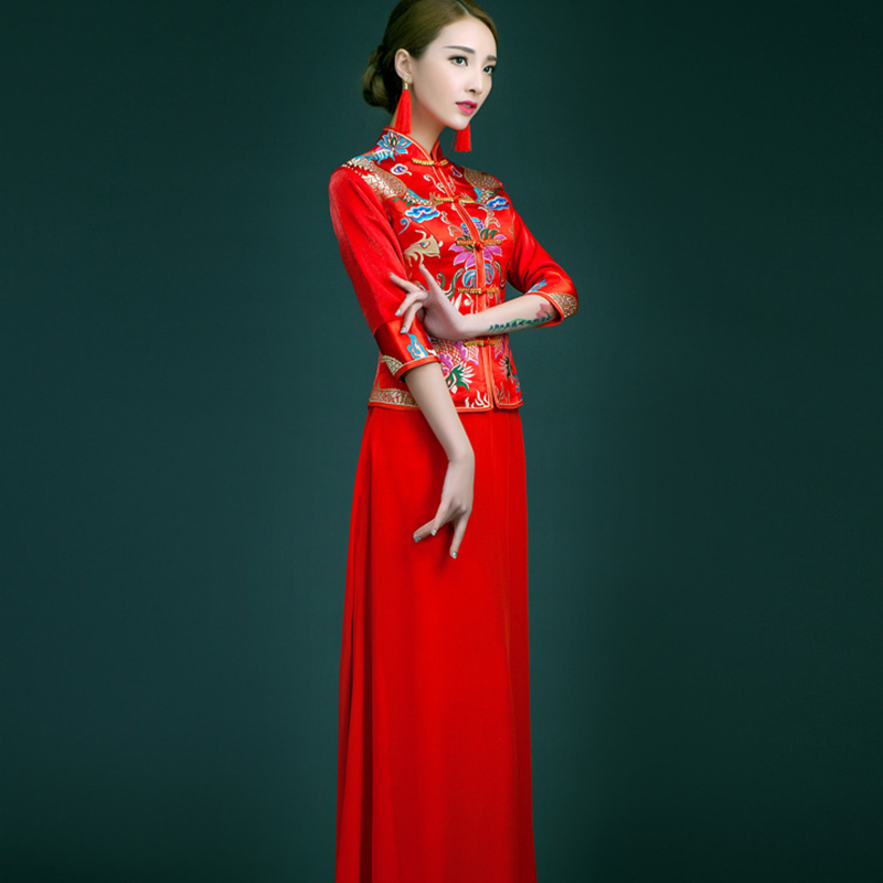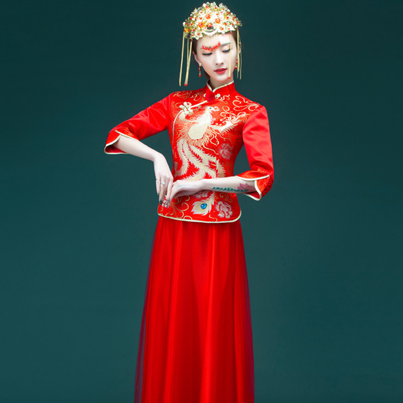 • 4中式新娘秀禾服長款紅色修身敬酒服 七分袖改良旗袍禮服嫁衣
