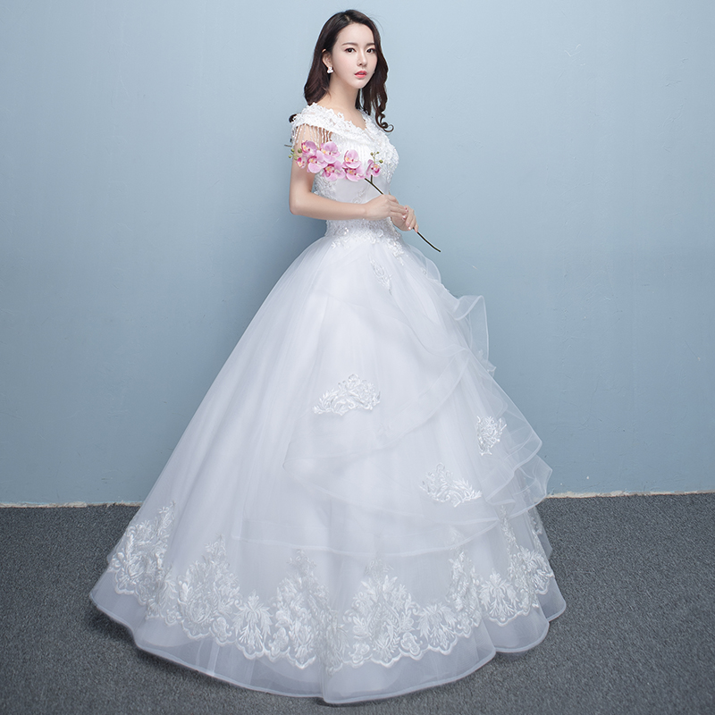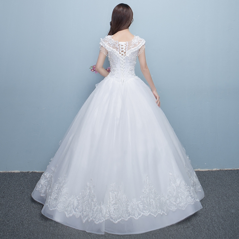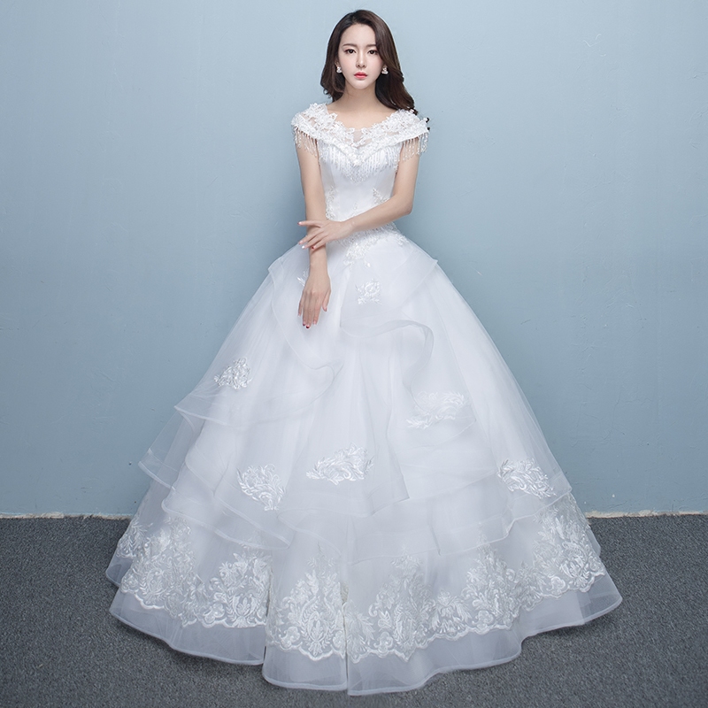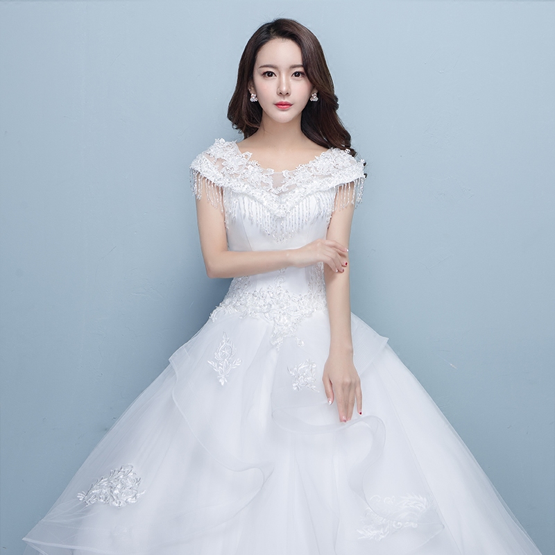 • 一字肩婚紗禮服2017新款韓式新娘結(jié)婚大碼顯瘦齊地婚紗公主蓬