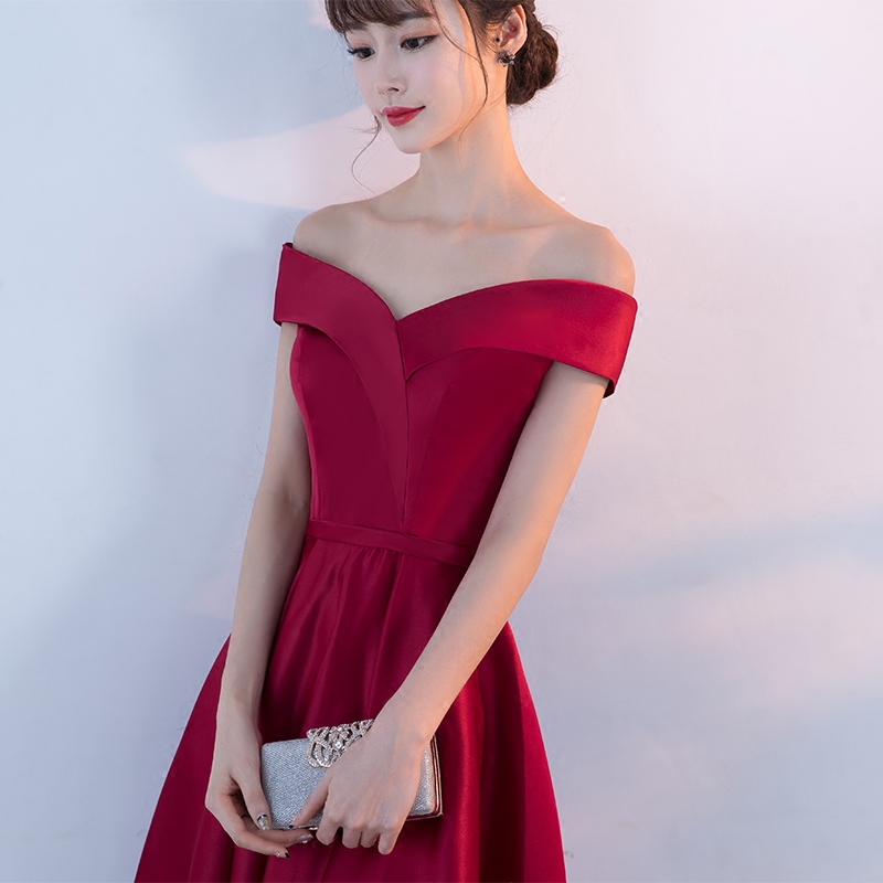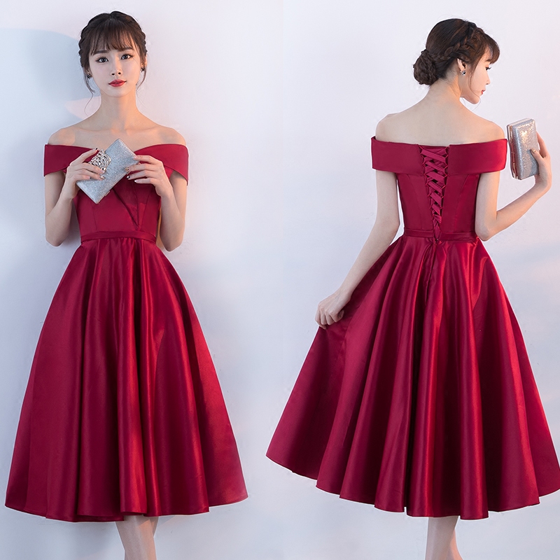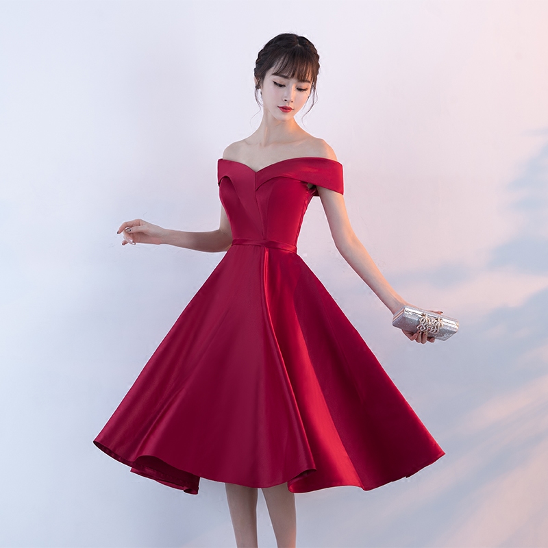• 新款夏季結(jié)婚敬酒服新娘紅色短款新娘回門服一字肩晚禮服