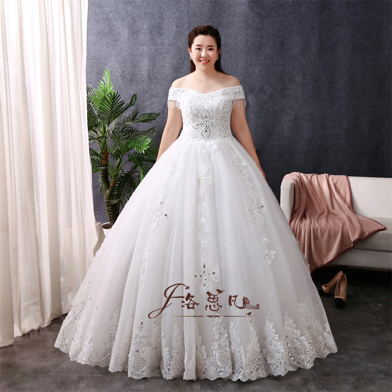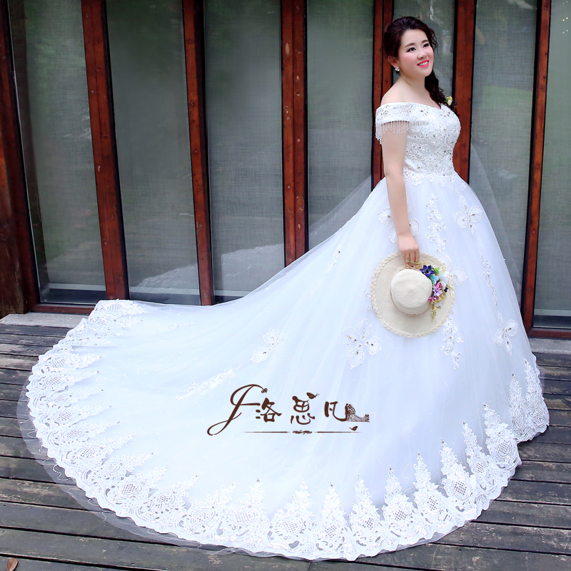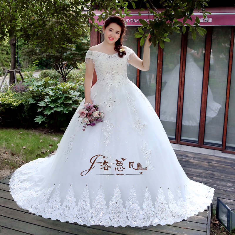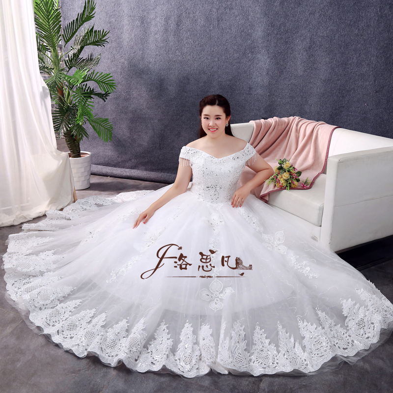 加肥大碼婚紗禮服胖mm顯瘦新娘歐式宮廷奢華復(fù)古一字肩長拖尾