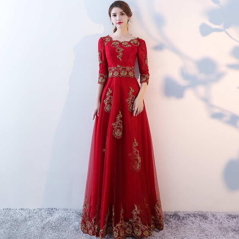 秋冬新品!2017新款秋一字肩修身顯瘦中袖結(jié)婚禮服長款
