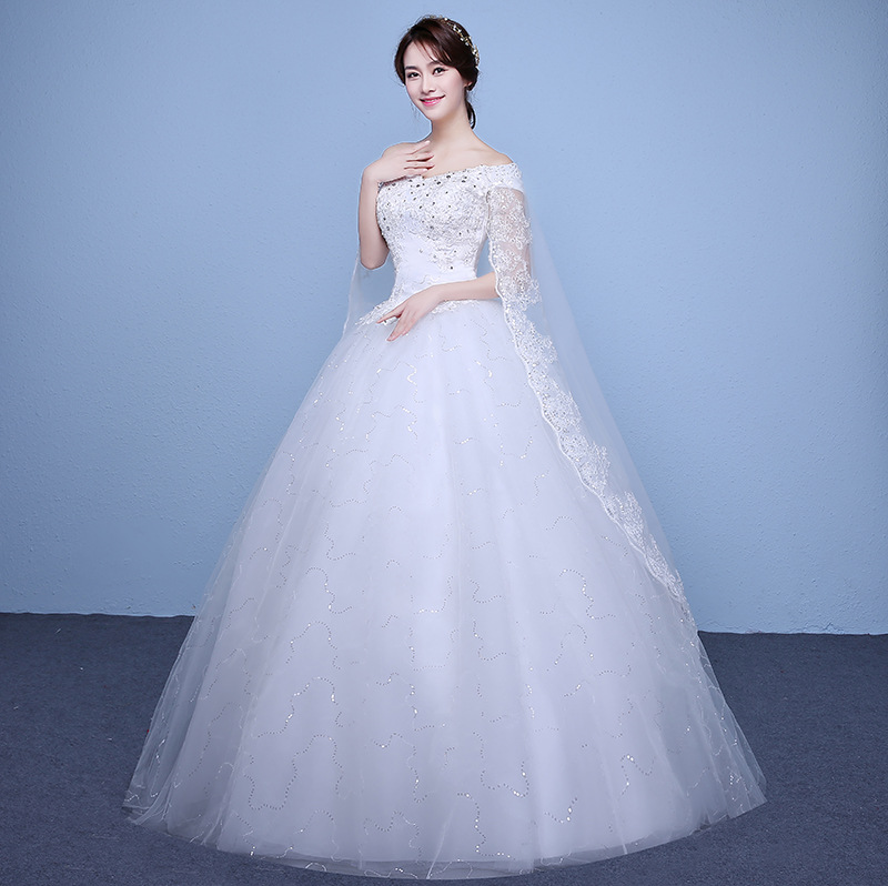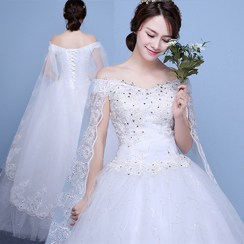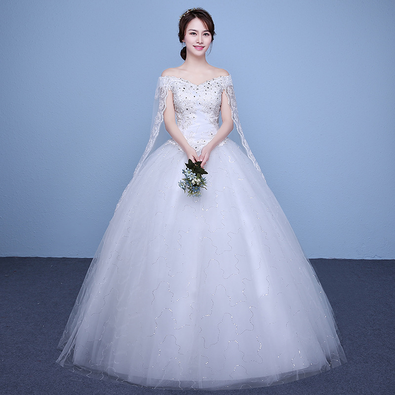 •  婚紗禮服新娘一字肩婚紗新款齊地大碼韓式顯瘦修身公主蓬蓬裙婚