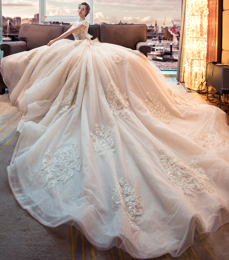 2017新款新娘結(jié)婚顯瘦長(zhǎng)拖尾一字肩公主夢(mèng)幻奢華孕婦婚紗