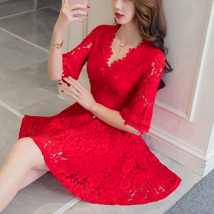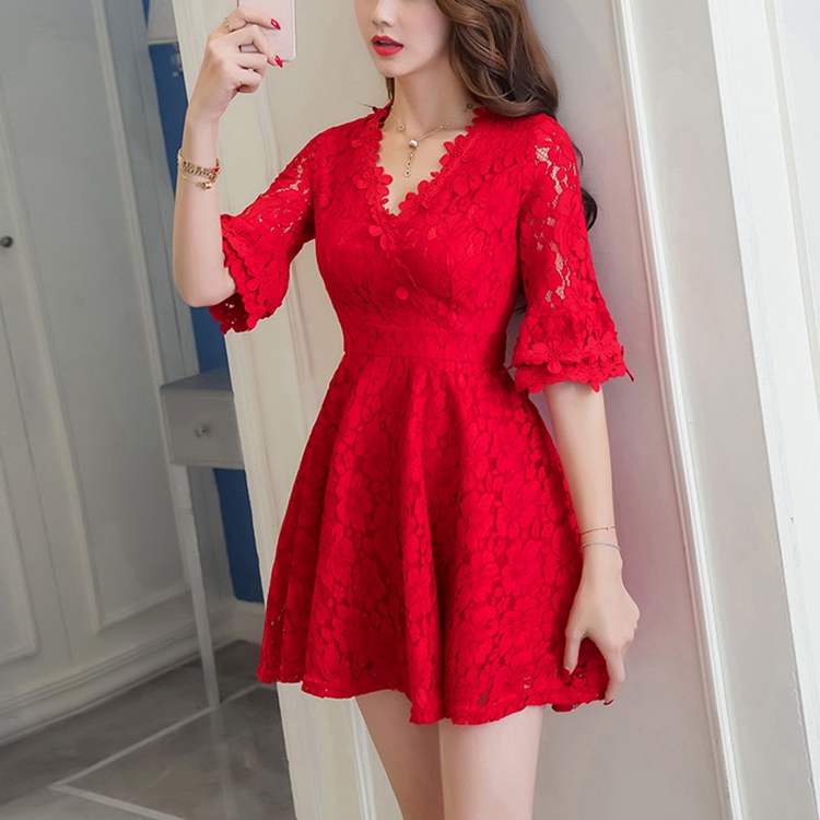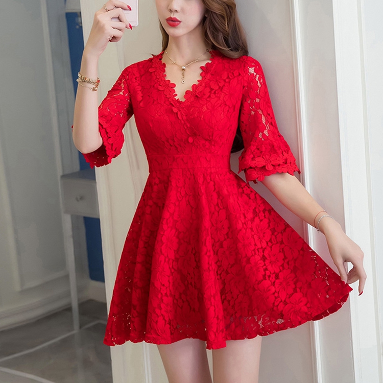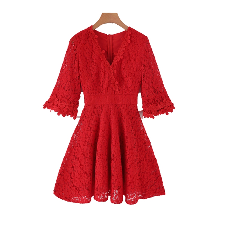 • 紅色短款夏季v領(lǐng)回門蕾絲連衣裙孕婦訂婚結(jié)婚小禮服
