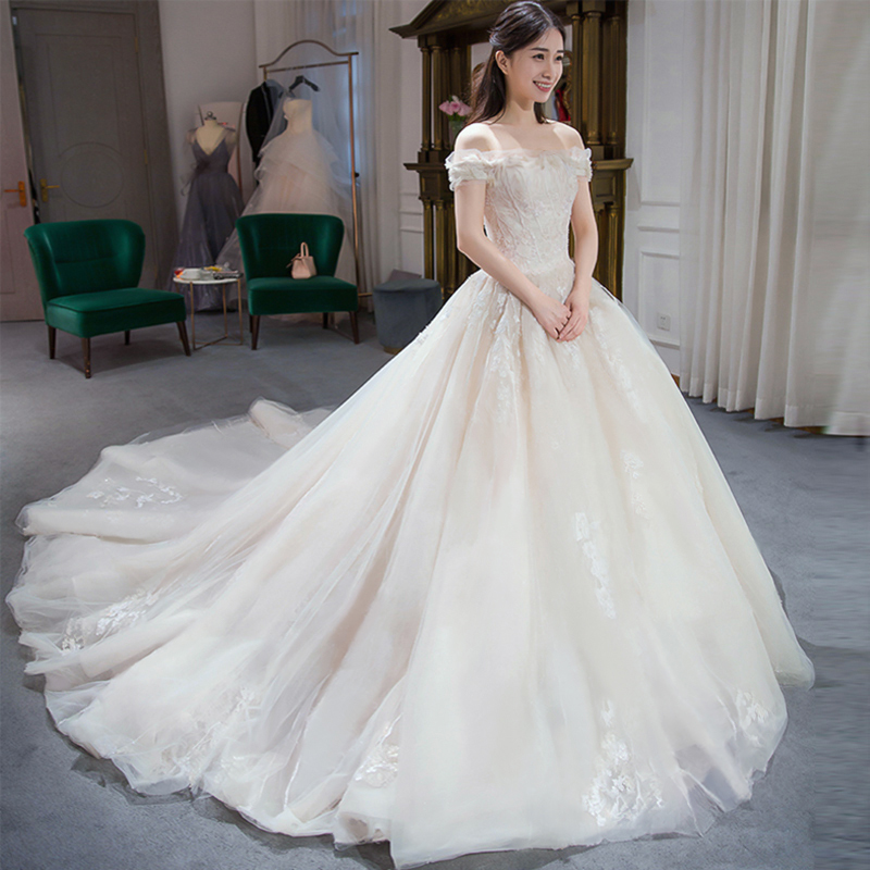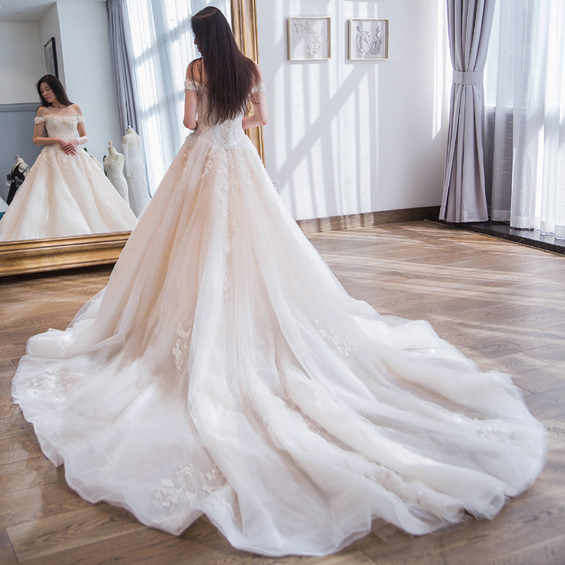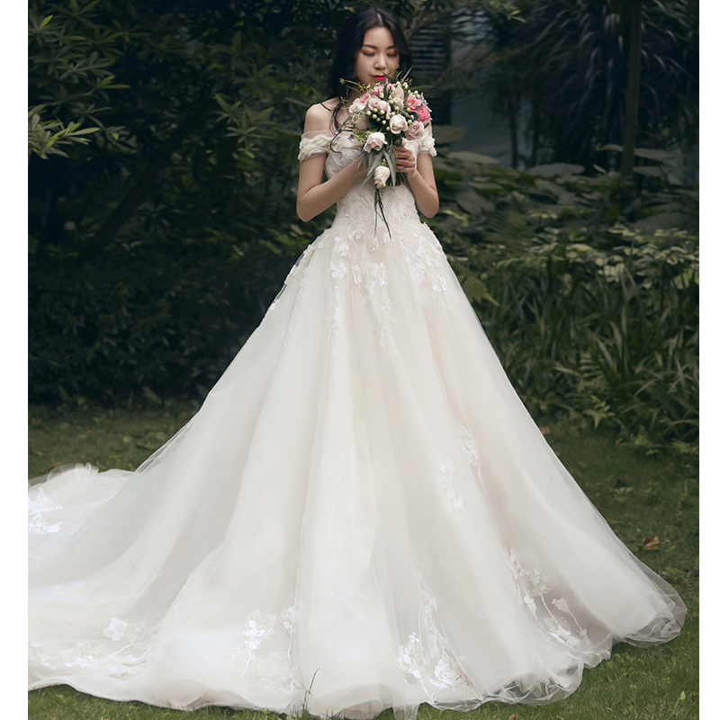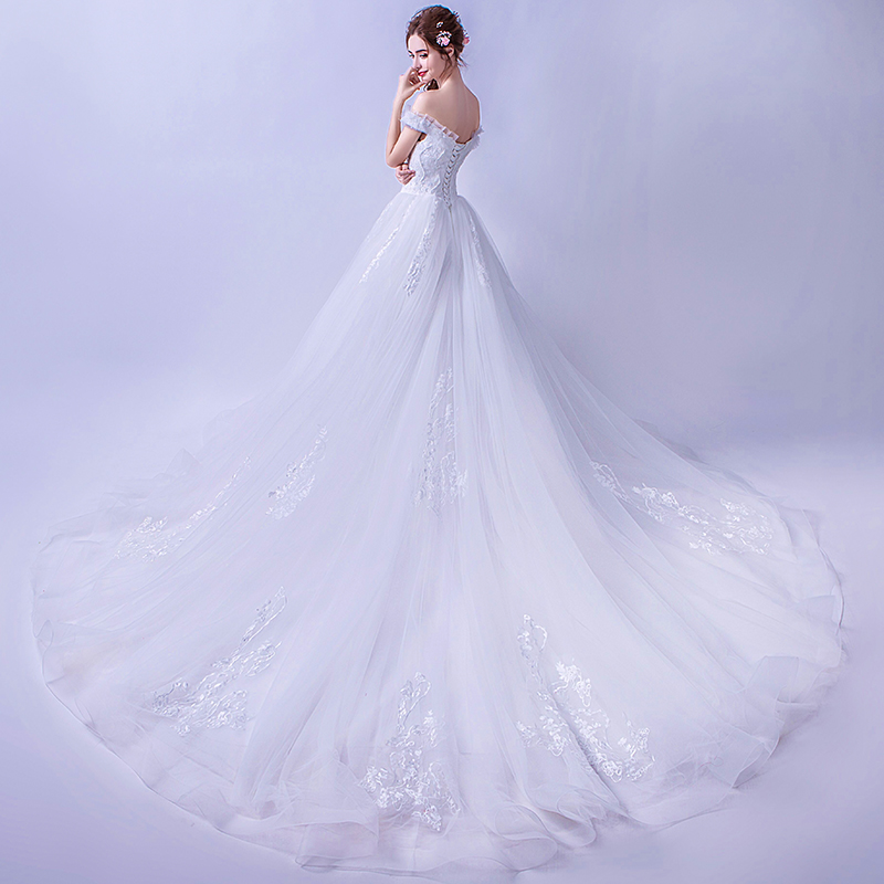 2017新款韓式一字肩新娘婚紗奢華宮廷拖尾花朵顯瘦公主蓬蓬