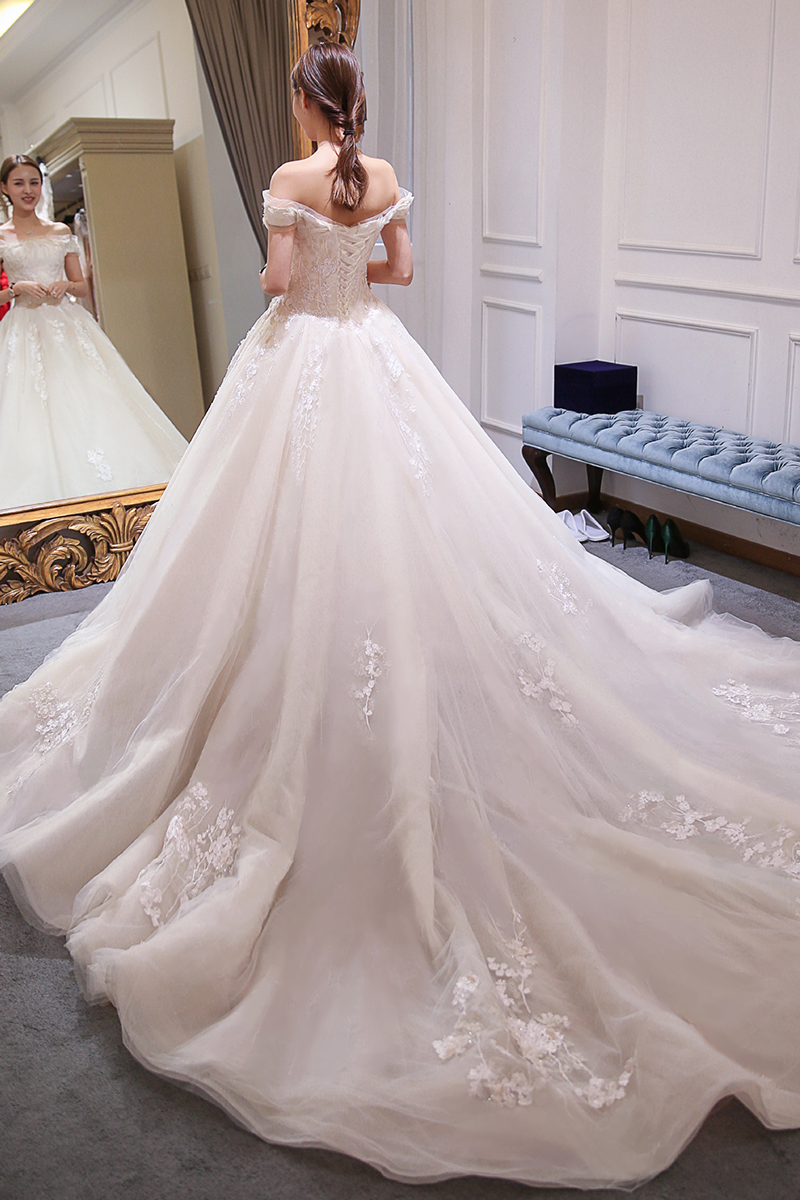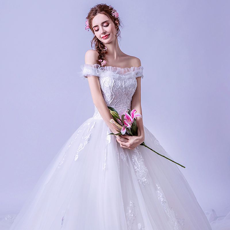 • 2017新款韓式一字肩新娘婚紗奢華宮廷拖尾花朵顯瘦公主蓬蓬