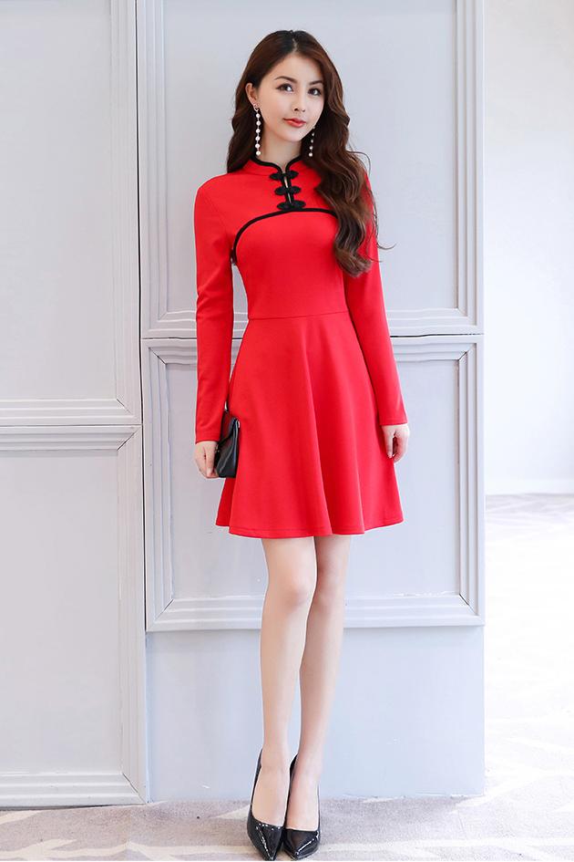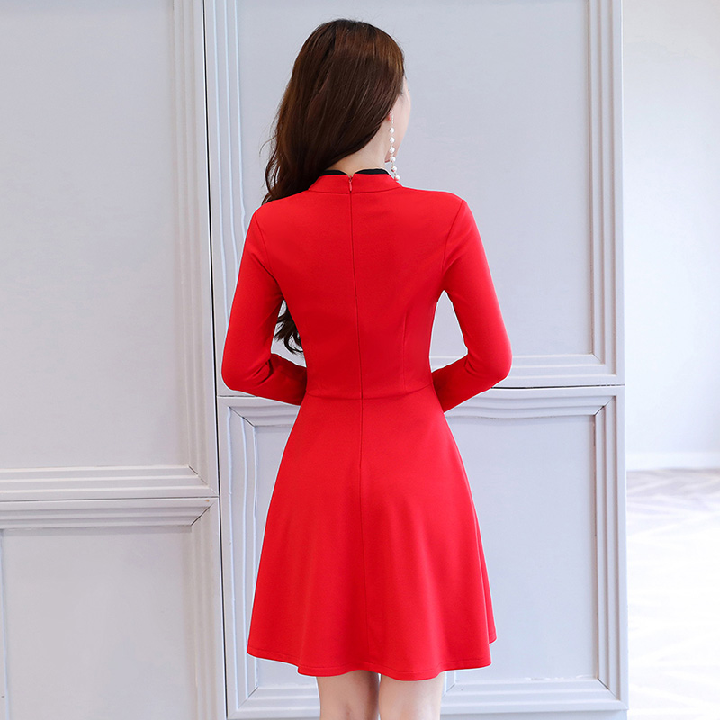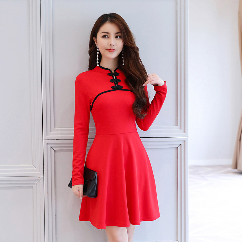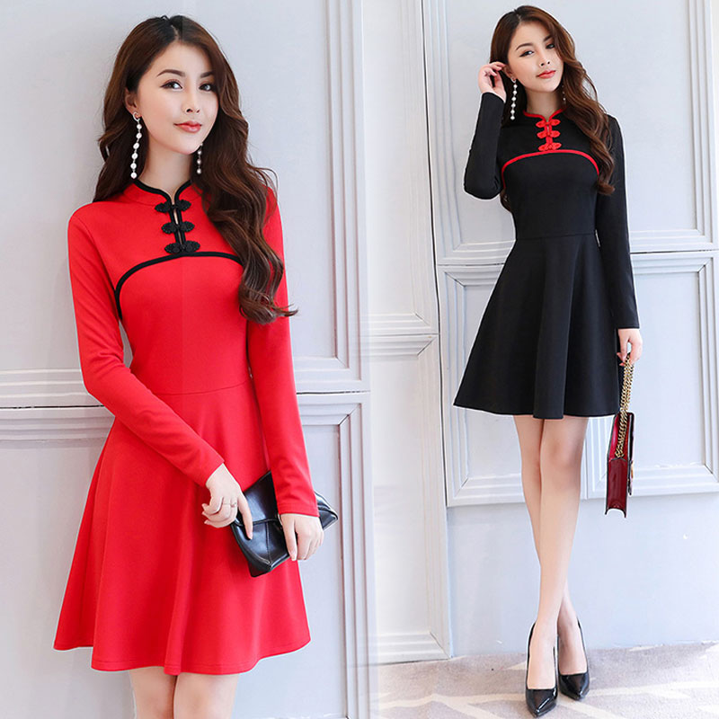 • 民族風(fēng)復(fù)古立領(lǐng)改良旗袍裙2017秋裝新款氣質(zhì)修身長袖A字連衣