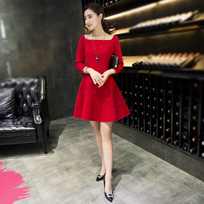 秋冬裝女2017新款修身紅色一字肩連衣裙中長(zhǎng)款結(jié)婚禮服新娘回