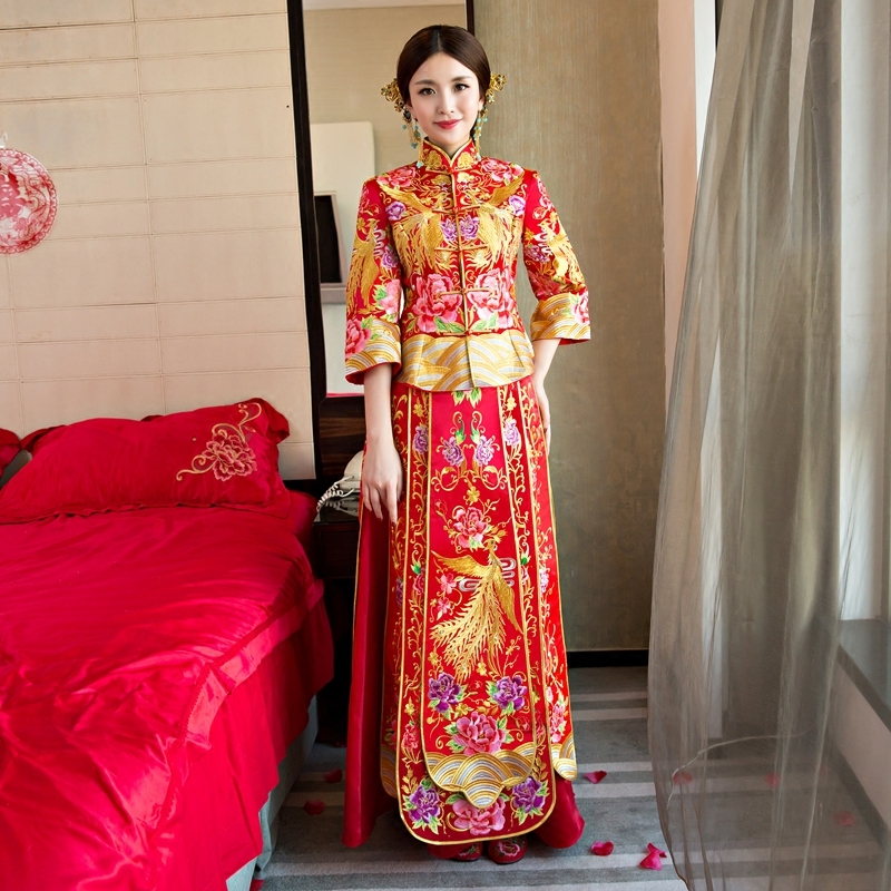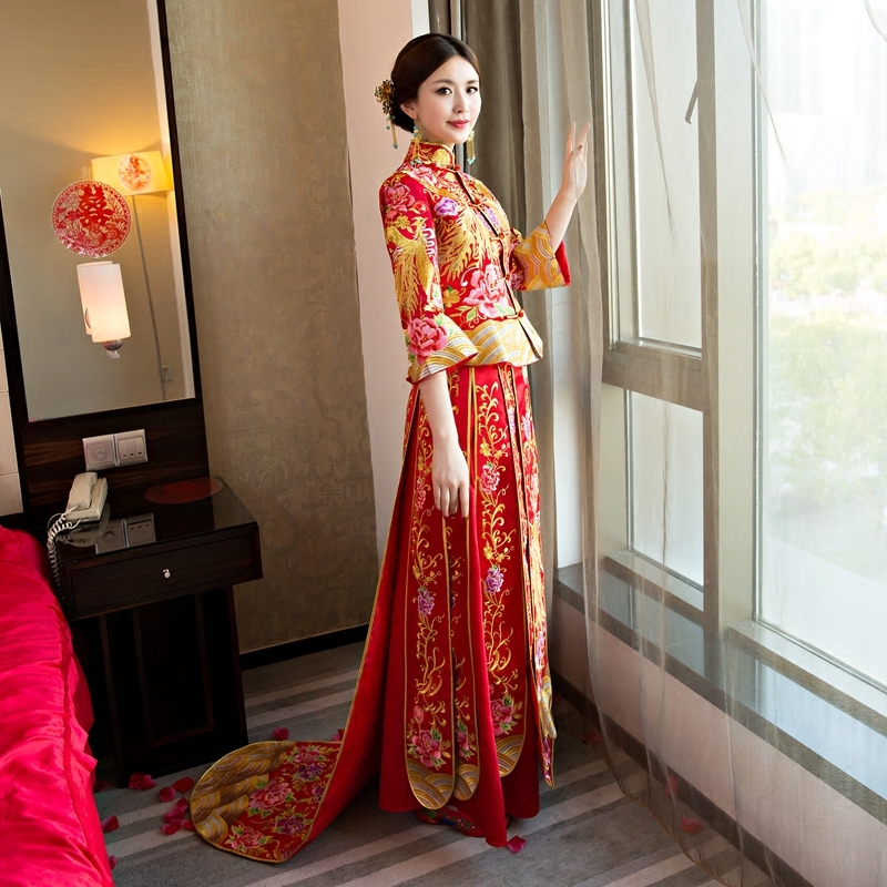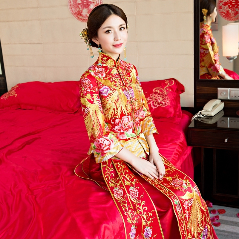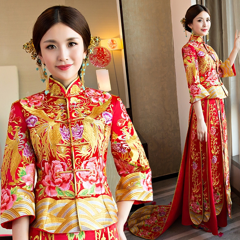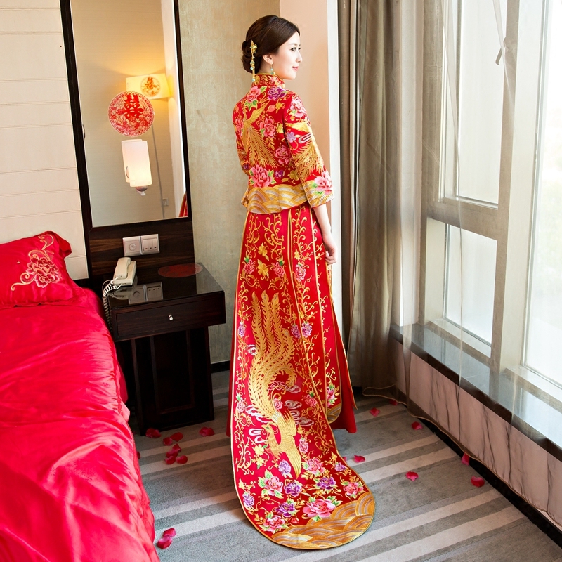 秀禾服中式結(jié)婚敬酒服新娘拖尾秀和服禮服修身龍鳳褂紅色婚紗旗袍
