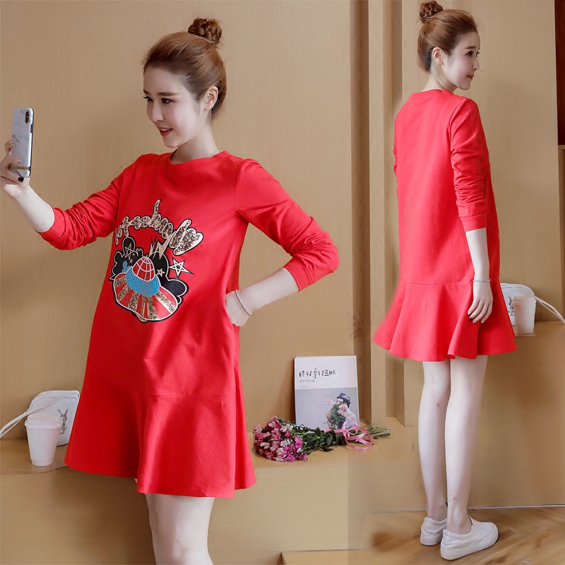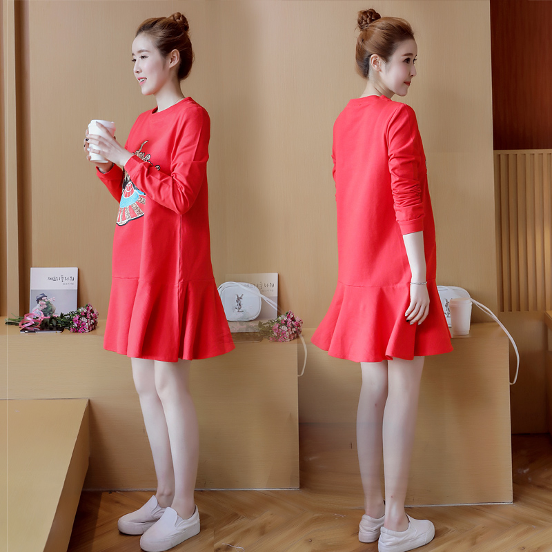 孕婦春裝連衣裙2018新款韓版懷孕期時(shí)尚版春秋裙子中長(zhǎng)紅色上