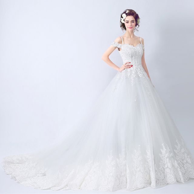 性感蕾絲一字肩公主新娘蕾絲花朵大拖尾婚紗禮服2016新款