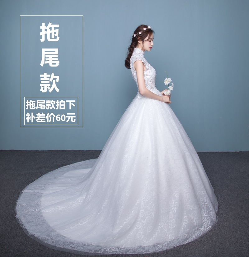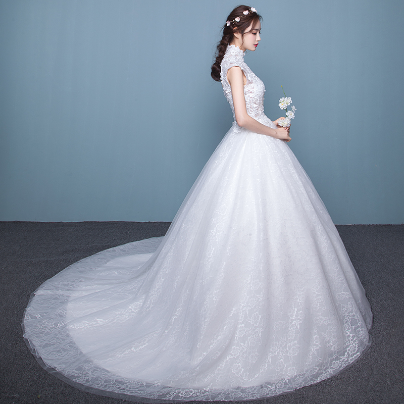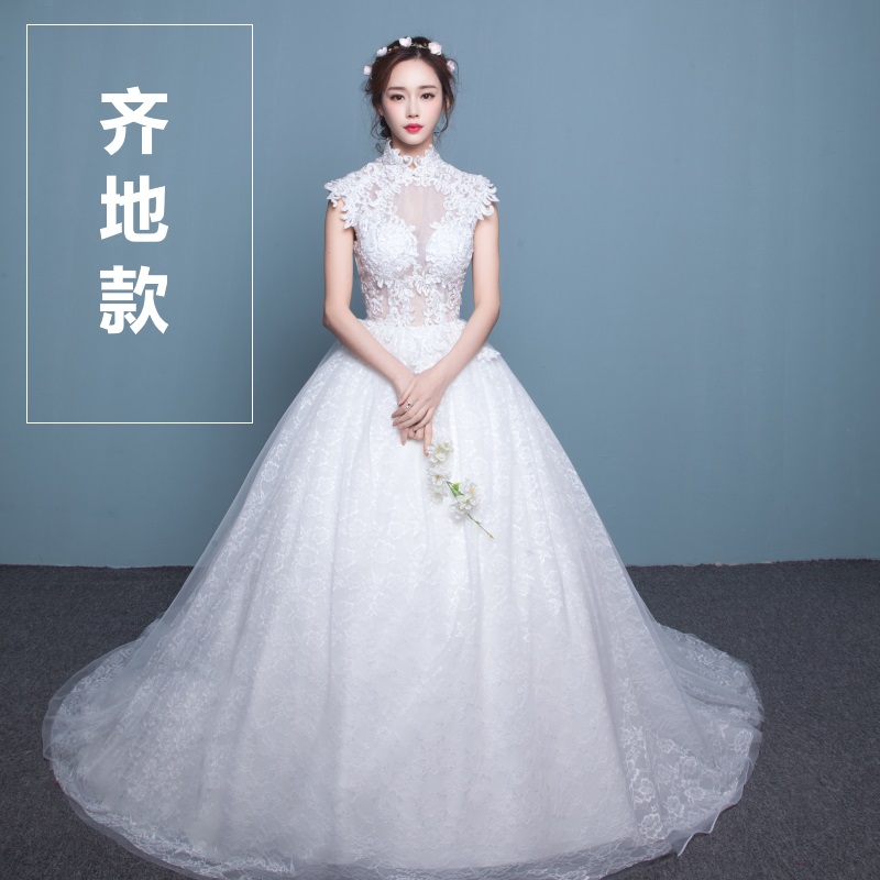 新娘婚紗禮服秋季新款韓式公主簡約齊地立領(lǐng)修身蕾絲結(jié)婚拖尾
