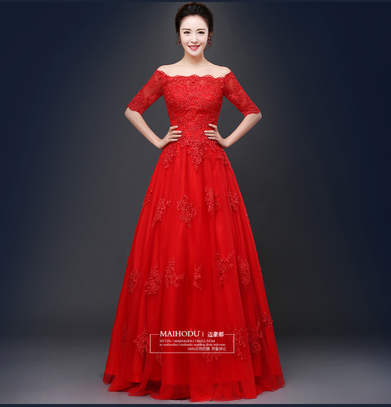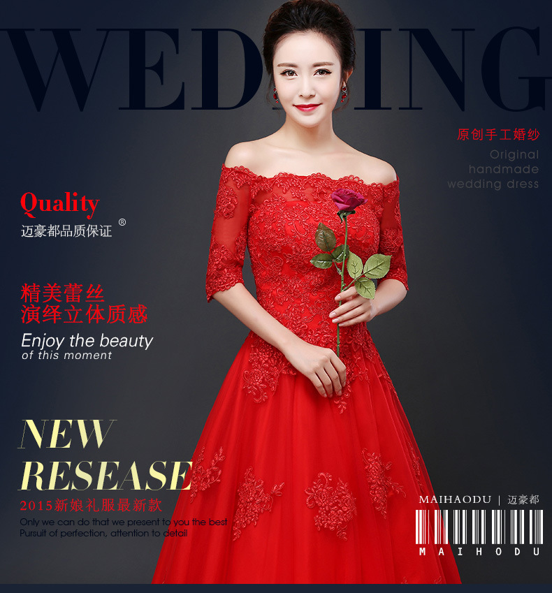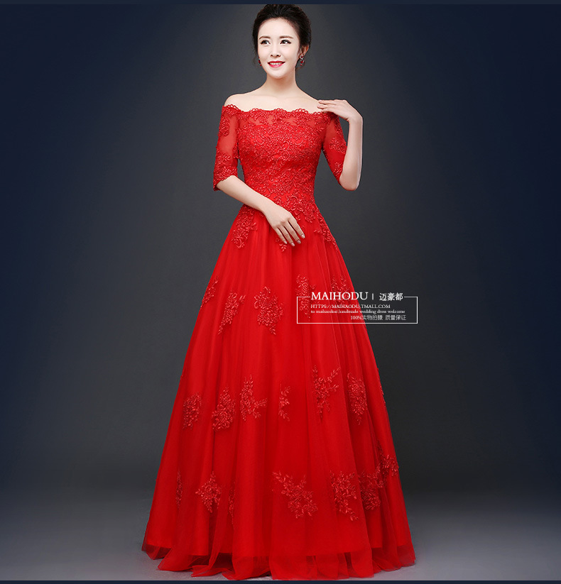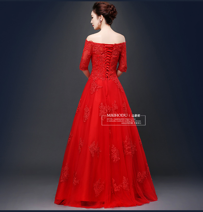 • 婚紗禮服2016新款新娘敬酒服一字肩長款結(jié)婚紅色婚紗一字34